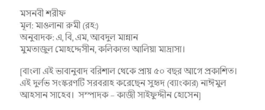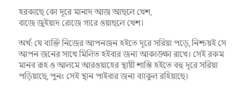 যে মুহূর্তে তুমি এখান থেকে চলে গেছ, আমি মােমের মত গলে গেছি, বিচ্ছিন্ন হয়ে গেছি জীবনের সকল স্বাদ ও আহলাদ থেকে। সারা রাত আমি মােমবাতির মত জ্বলতে থাকি; আগুনের সঙ্গে সাক্ষাৎ ঘটলেও মধুর স্বাদ থেকে বঞ্চিত আমি।। তােমার সৌন্দর্য সুখ থেকে বঞ্চিত হবার কারণে আমার দেহ-মন পেঁচকের মত বিরান হয়ে গেছে। একটু এদিকে তােমার অশ্বের গতি ফেরাও; আমার জীবনের হস্তীশুণ্ডকে একট ম্যৰূত কর। তােমার উপস্থিতি ব্যতিরেকে সামা’র মজলিস বৈধ নয়; আমার জীবন মালঞ্চের ওপর শয়তানসদৃশ বােঝা চেপে বসেছে। তােমা ব্যতিরেকে কোন গীতি গীত হয়নি, এমতাবস্থায় মুবারক লিপি এসে পেীছল। তােমার পবিত্র লিপি শােনার আনন্দে পাঁচ-ছ’টি কাব্য লিখে ফেলেছি। তােমার সন্দর্শনে আমার সন্ধ্যাও যেন ভােরের ন্যায় আলােকিত হয়ে ওঠে। ওহে। যার সত্তার জন্য শাম, আরমান ও রােম গর্বিত।
