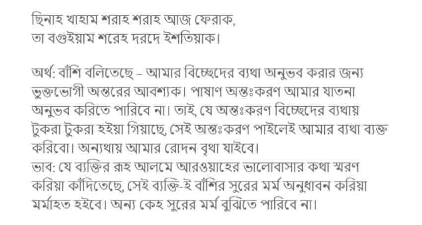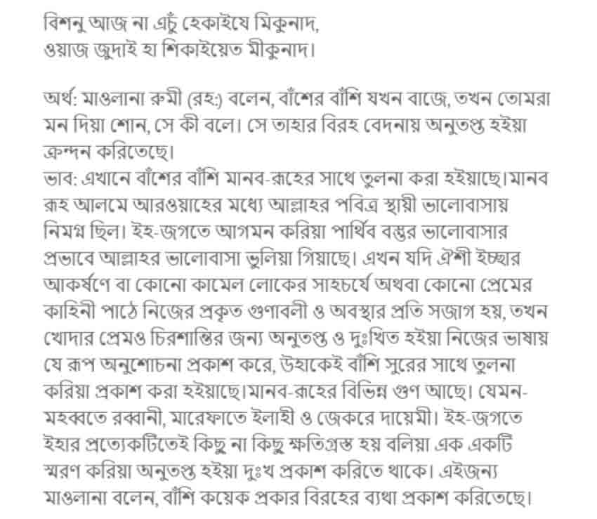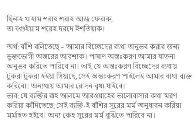 ‘আশিকের খাদ্যই হচ্ছে সামা’র মাহফিল; কেননা এর দ্বারাই একাগ্রতা ও মানসিক প্রশান্তি আসে। অন্তরের কল্পনা একটা উল্লেখযােগ্য পরিমাণ শক্তি লাভ করে, বরং বাঁশীর আওয়াজে তার একটা ব্যবস্থা কিংবা সুরাহা হয়ে যায়। প্রেমের আগুন শব্দ দ্বারা আরাে বেগবান হয়েছে, যেরূপ এই অগ্নিকুণ্ডে কয়লা নিক্ষেপকারীর আগুনের অবস্থা।